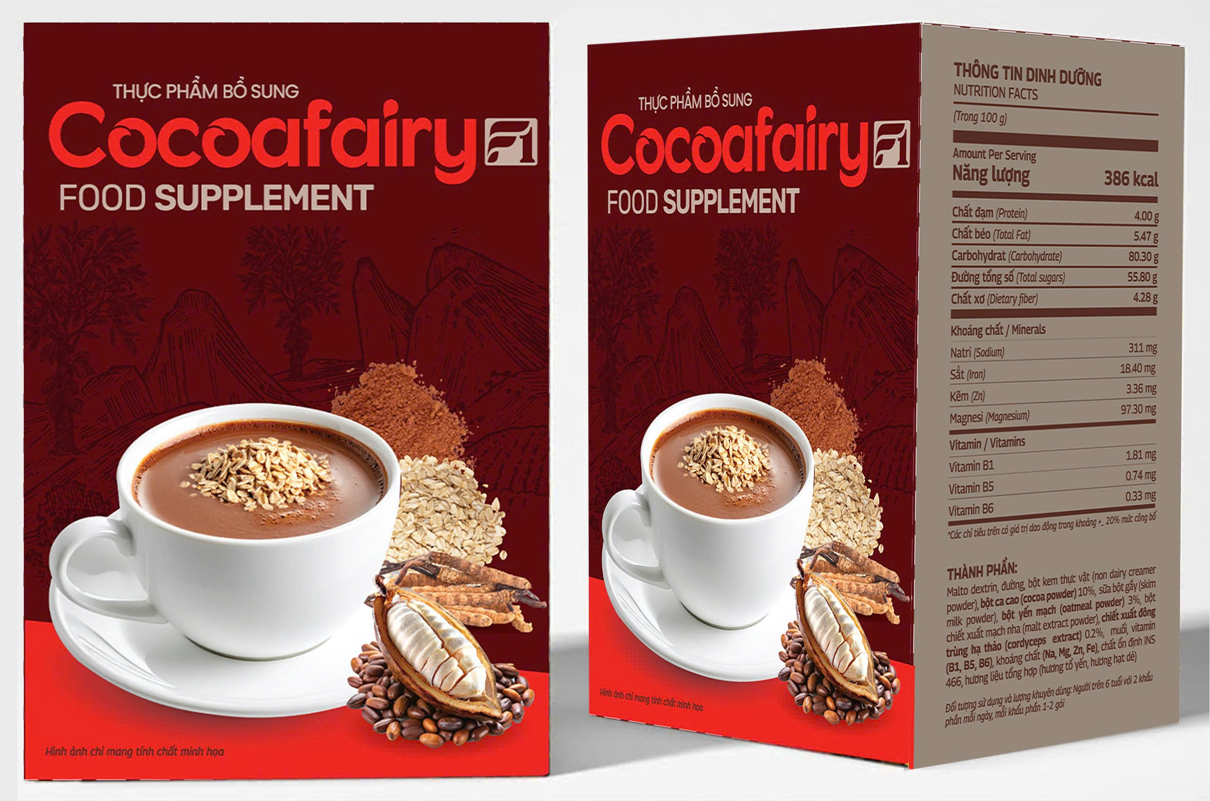 bột ca cao (cocoa powder) 10%, sữa bột gầy (skim milk powder),